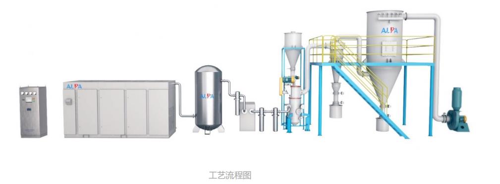 壓縮空氣經(jīng)過濾干燥后,通過拉瓦爾噴嘴高速噴射入粉碎腔,在多股高壓氣流的交匯點(diǎn)處物料被反復(fù)碰撞、磨擦、剪切而粉碎,粉碎后的物料在風(fēng)機(jī)抽力作用下隨上升氣流運(yùn)動(dòng)至分級區(qū),在高速旋轉(zhuǎn)的分級渦輪產(chǎn)生的強(qiáng)大離心力作用下,粗細(xì)物料分離,符合粒度要求的細(xì)顆粒通過分級輪進(jìn)入旋風(fēng)分離器和除塵器收集,粗顆粒下降至粉碎區(qū)繼續(xù)粉碎。
